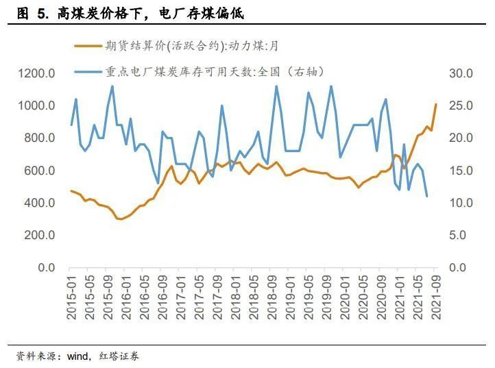 这时候高煤价就会反噬需求,受限于煤炭价格持续上涨,电厂用煤比较谨慎,电厂存煤明显下滑。这在一定程度上限制了火电的供给,使得其不能够有效的弥补水电不足以及需求旺盛带来的电力供需缺口。