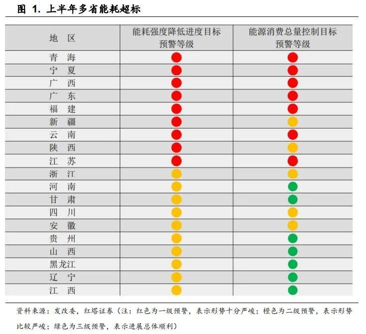 这可能和今年上半年多地能耗双控不达标有关。8月发改委发布的《2021 年上半年各地区能耗双控目标完成情况晴雨表》显示今年上半年有7个省份能耗双控目标均为红色一级预警,有19个省份至少有一项是橙色预警。