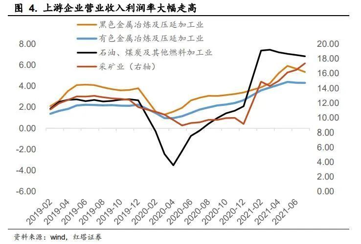在大宗商品价格持续攀升的情况下,上游利润率以及利润同比增速持续走高,1-7月采矿业利润率为17.37%,创下近年来的新高。