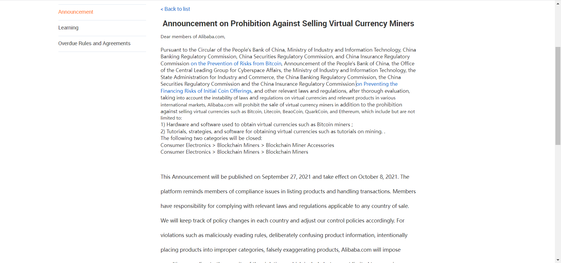 9月27日,阿里巴巴国际站官方发布《关于禁售虚拟货币矿机类产品的公告》。称将于10月8日起开始仅售虚拟货币矿机类产品。