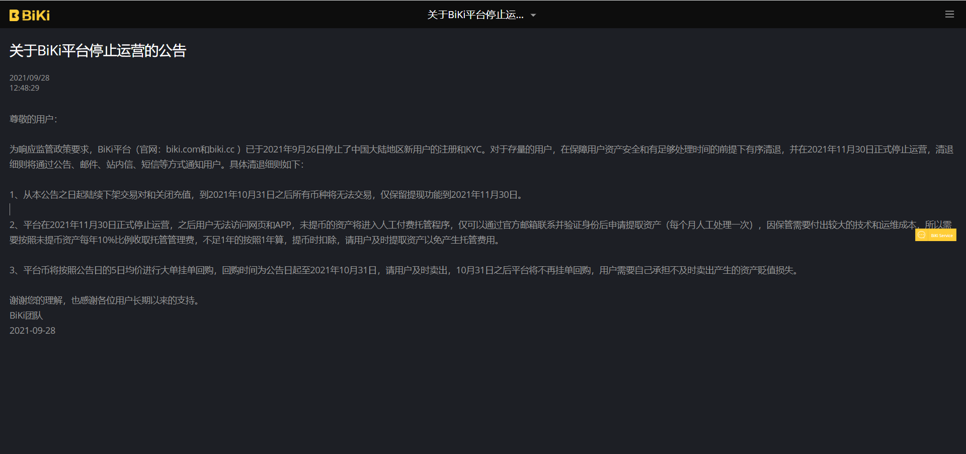 9月28日,加密货币交易所BiKi发布《关于BiKi平台停止运营的公告》,称为响应监管政策要求,已于 2021年9月26日停止了中国大陆地区新用户的注册和 KYC。之后,BiKi 将对存量用户在保障资产安全和有足够处理时间的前提下有序清退,并在 2021年11月30日正式停止运营。届时,用户将无法访问网页和 APP,而未提取的资产将进入人工付费托管程序。