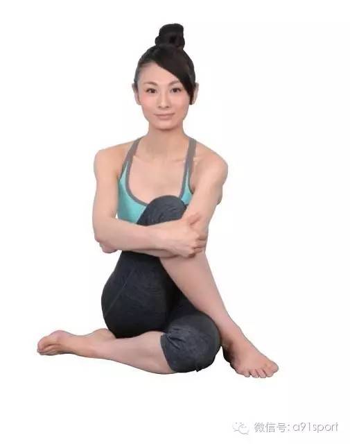 盘腿而坐,双手环抱立起来的脚的膝盖。