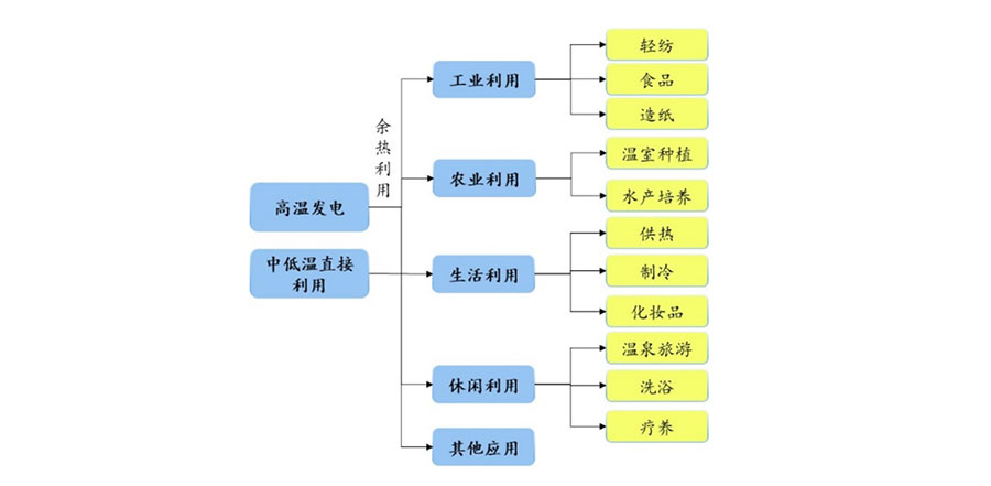 地热能利用主要分为直接利用和地热发电两大类。地热能直接利用已广泛地应用于工业加工、民用采暖和空调、洗浴、医疗、农业温室、农田灌溉、土壤加温、水产养殖、畜禽饲养等各个方面。地热发电是把地下的热能转变为机械能再转变为电能的能量转变过程,在全球20多个国家已有应用。