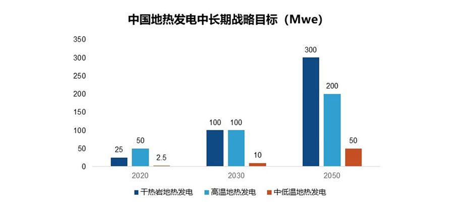 中国适于发电的高温地热资源主要分布在西藏、云南和台湾等地区,2019年我国地热能发电装机容量约为26MW,规划到2020年我国干热岩地热发电装机容量将达25MWe,2030年达到100MWe。