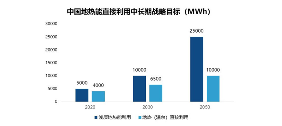 在地热直接利用方面,到2020年我国浅层地热能利用将达5000MWh,地热(温泉)直接利用4000MWh;预计到2050年我国浅层地热能利用将达25000MWh,地热(温泉)直接利用10000MWh。