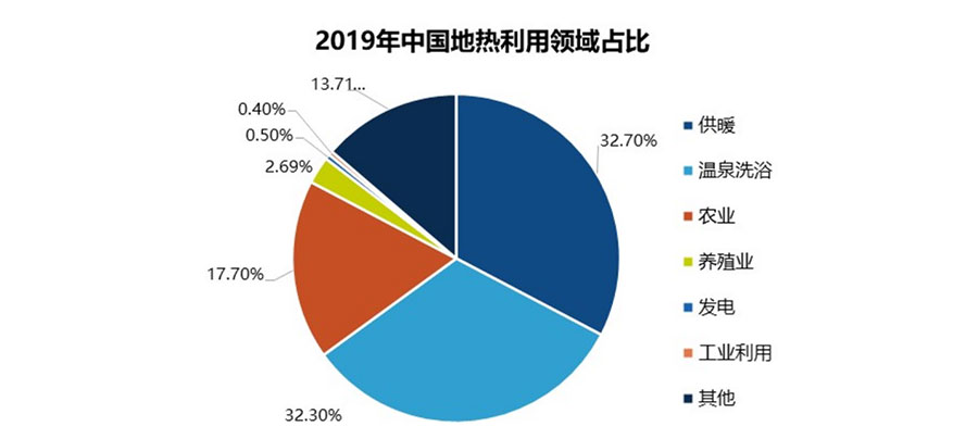 根据2019年中国地热能利用数据分析,2019年地热供暖利用占比32.7%;地热温泉洗浴利用占32.3%;地热农业领域利用占17.9%;地热养殖业领域利用占2.69%;地热发电领域占比0.5%;工业利用领域占比0.4%。2019年,我国浅层地热能建筑供暖(制冷)建筑面积达8.41亿平方米,水热型地热能供暖建筑面积超过1.65亿平方米。