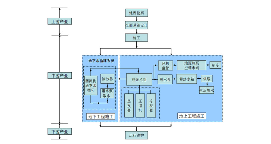 地源热泵产业链主要沿着地热开发及应用展开,主要涉及地热应用技术开发、地热设备制造、地热污染与环境管理等产业内容,其中最主要的产业环节为地缘热泵设备制造。