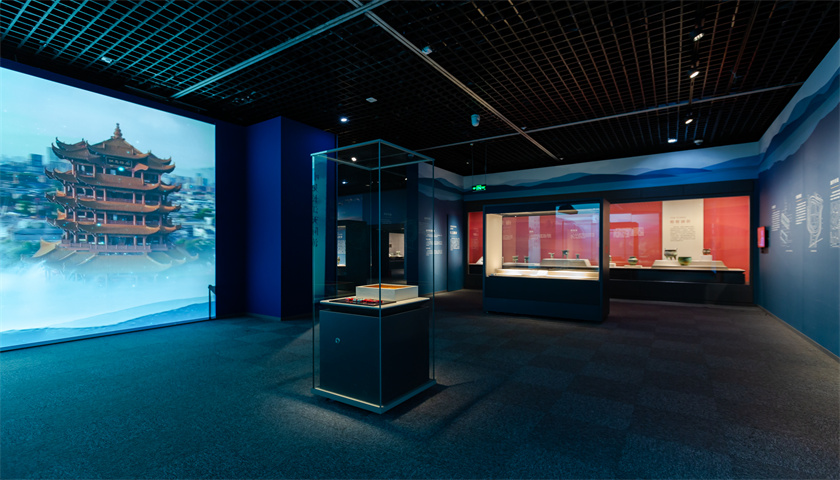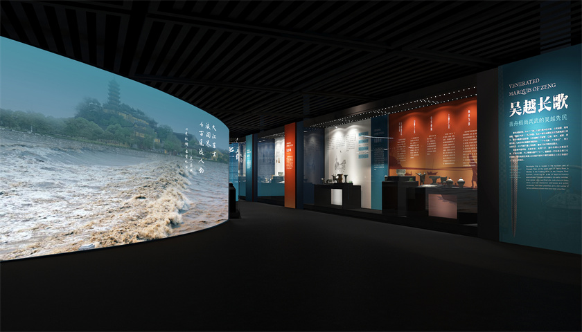 “群雄竞华”展区:整体色调明快,在立面上大块使用橙红色,实现视觉空间豁然开朗,寓意长江中下游丰饶辽阔,其意境兼具荆楚文化的瑰丽和吴越文化的隽秀。