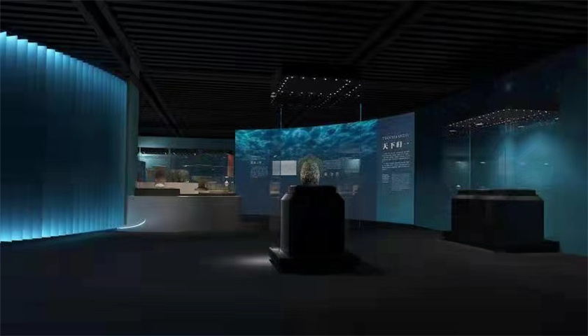展览序厅、尾厅:设计优雅的弧形空间,呼应长江水文特征。序厅专设沉浸式空间,整体施以青铜般蓝绿,顶部用波纹镜配光影设备,营造长江波光粼粼的艺术效果,整体氛围感染力强。