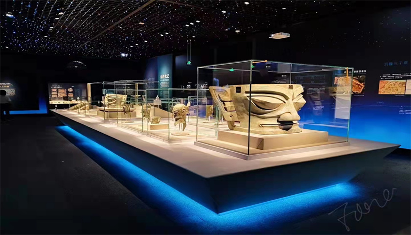 “巴蜀并辉”展区:用满天星光,渲染长江上游巴蜀青铜文明的古老与神秘,寓意古蜀文明在历史长空中璀璨夺目。从“巴蜀并辉”经过一段蜿蜒曲折、神似三峡意境的通道,即进入江汉平原“群雄竞华”展区。