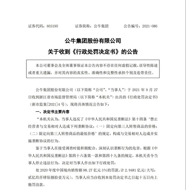 9月27日晚间,公牛集团(603195.SH)发布公告称,公司收到浙江省市场监督管理局出具的《行政处罚决定书》,因违反反垄断法被处2020年度中国境内销售额3%的罚款,计2.95亿元。