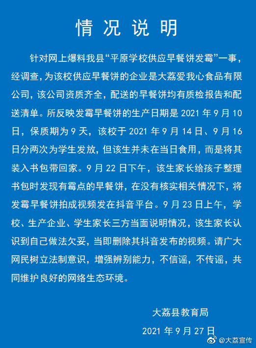 据@大荔宣传 微博消息,日前,大荔县教育局发布清空说明:针对网上爆料大荔县“平原学校供应早餐饼发霉”一事,经调查,为该校供应早餐饼的企业是大荔爱我心食品有限公司,该公司资质齐全,配送的早餐饼均有质检报告和配送清单。所反映发霉早餐饼的生产日期是2021年9月10日,保质期为9天,该校于2021年9月14日、9月16日分两次为学生发放,但该生并未在当日食用,而是将其装入书包带回家。9月22日下午,该生家长给孩子整理书包时发现有霉点的早餐饼,在没有核实相关情况下,将发霉早餐饼拍成视频发在网络平台。9月23日上午,学校、生产企业、学生家长三方当面说明情况,该生家长认识到自己做法欠妥,当即删除其发布的视频。