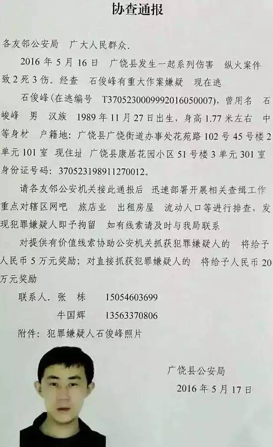 案发次日上午11点25分,广饶县公安局在已经掌握“一定的证据”后,针对石俊峰发布了通缉令。通缉令中,对提供有价值线索协助公安机关抓获犯罪嫌疑人的,将给予人民币5万元奖励;对直接抓获犯罪嫌疑人的,将给予人民币20万元奖励。警方开始全面布控对石俊峰的抓捕行动,“他闹大了,危害公共安全了。”一名民警说。
