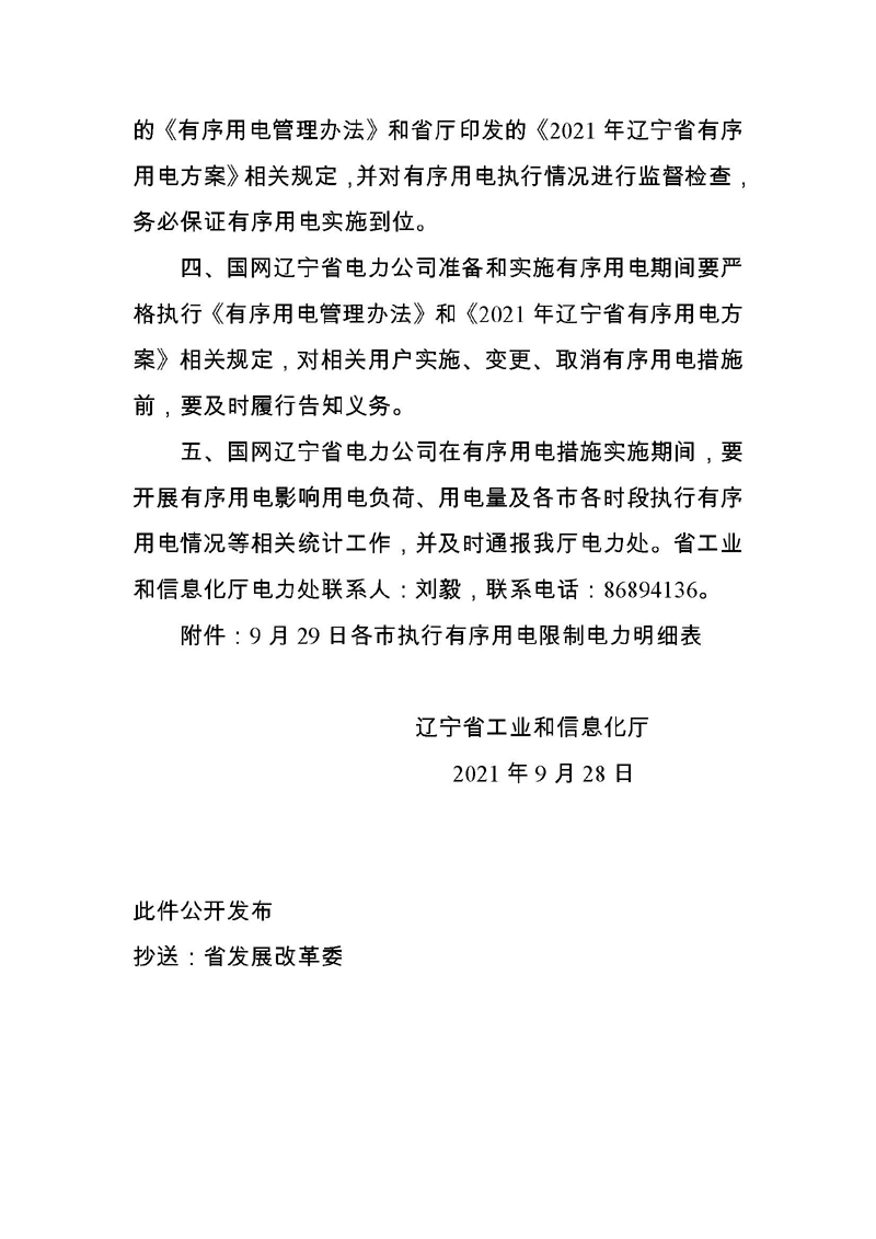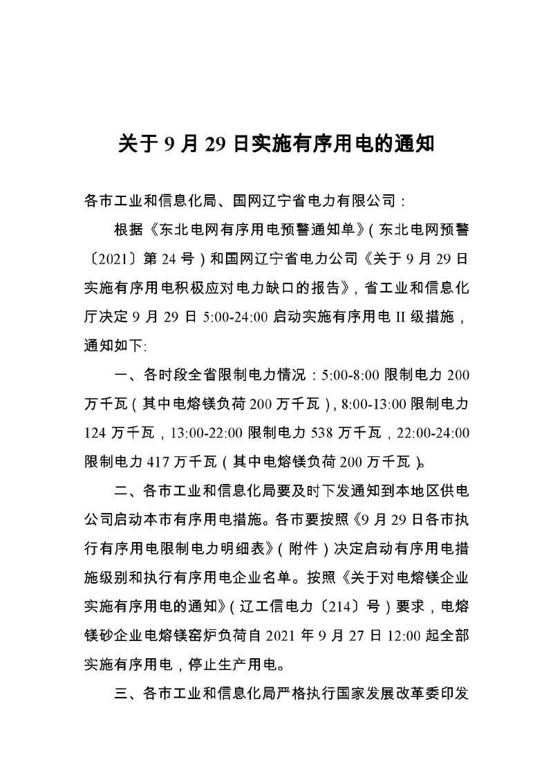 据辽宁省工业和信息化厅网站9月28日消息,根据东北网调预测,9月29日全省最大电力缺口达到538万千瓦,依据国家发改委《有序用电管理办法》,达到严重缺电II级橙色预警信号。决定9月29日5:00-24:00在全省启动实施有序用电II级措施,各时段全省负荷缺口如下:5:00-8:00负荷缺口200万千瓦,8:00-13:00负荷缺口124万千瓦,13:00-22:00负荷缺口538万千瓦,22:00-24:00负荷缺口417万千瓦。