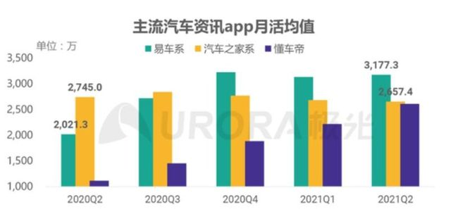 据极光《2021年Q2移动互联网行业数据研究报告》显示在主流汽车资讯app中,易车系应用表现突出。今年Q2月活用户较去年同期增长迅猛,MAU均值达3177.3万,同比增幅为57.2%,自2020年Q4以来一直位居行业第一。