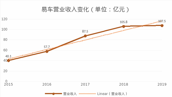 从2015年至2019年,易车的营收从40.1亿元涨为了107.5亿元,4年间增幅达到168.1%,但增速却日落西山,从最初的109.5%降为了如今的1.6%。