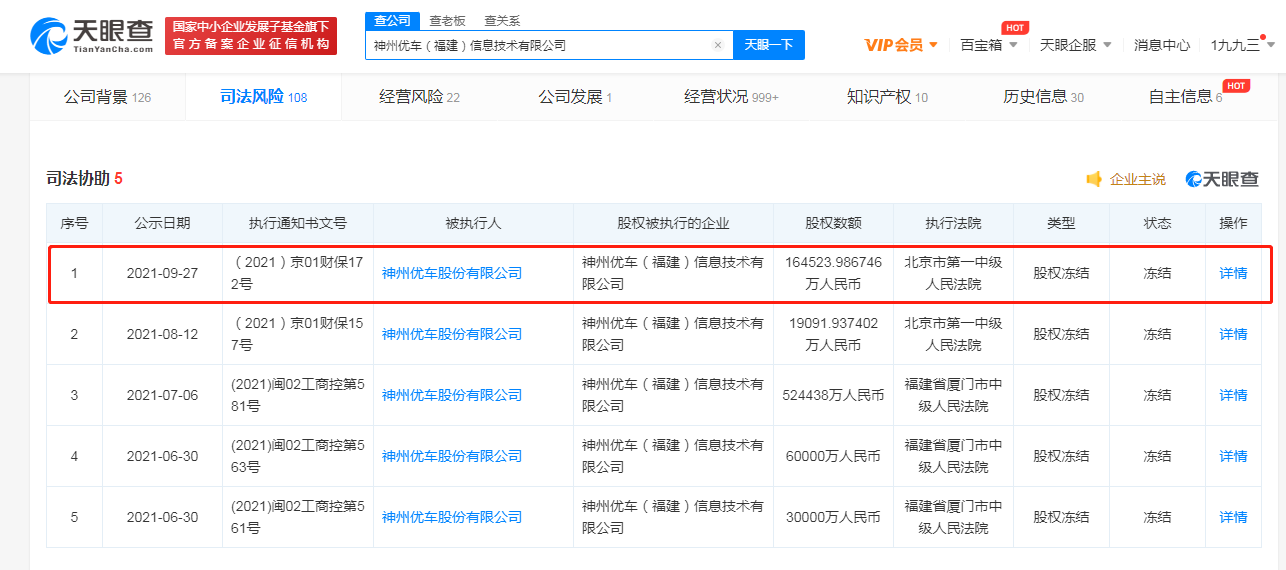 据天眼查APP显示,9月27日,神州优车(福建)信息技术有限公司新增股权冻结信息,被执行人为神州优车股份有限公司,股权数额约16.45亿人民币,执行法院为北京市第一中级人民法院,执行通知文书号(2021)京01财保172号。值得一提的是,神州优车股份有限公司在该公司共有5条股权被冻结信息,累计被冻结股权数额约80亿。