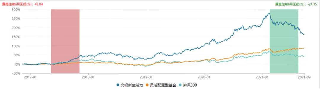 “交银新生活力”成立以来的总回报为164.50%,而同期沪深300只有43.03%,从这一角度看,该基金的收益表现还是可圈可点的。