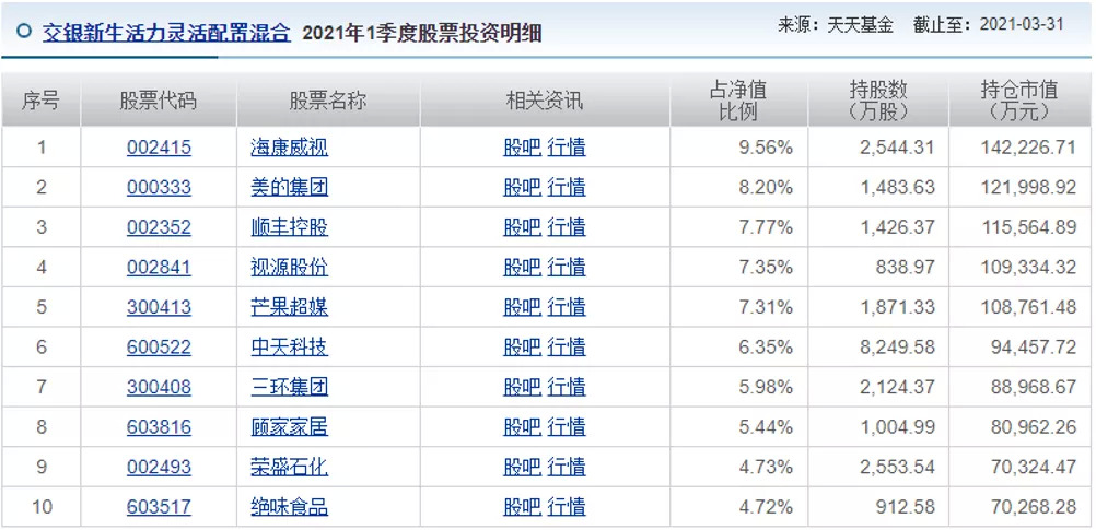 从资产配置上看,“交银新生活力”属于典型的集中持股,90%的股票仓位,前十大重仓股就占了70%。简单来说,就是业绩走势基本上以这十只股票的表现为基调了。