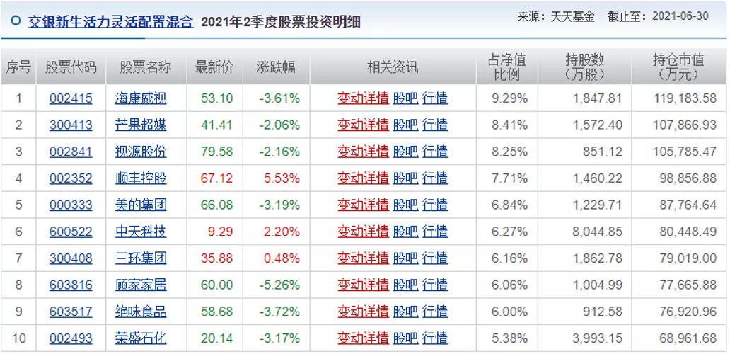 “交银新生活力”以传媒、物流、家电为主,然而第二季度国内投资和消费数据低于预期,互联网平台、教育等行业被整顿,在这种背景下,传统消费板块、家电等传统白马股走势较弱,这也是其基金表现落后的原因之一。