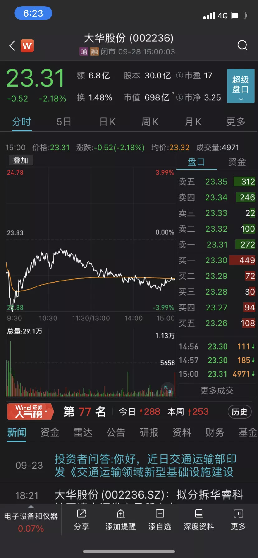 截至9月28日收盘,大华股份股价收报23.31元,总市值约698亿元。