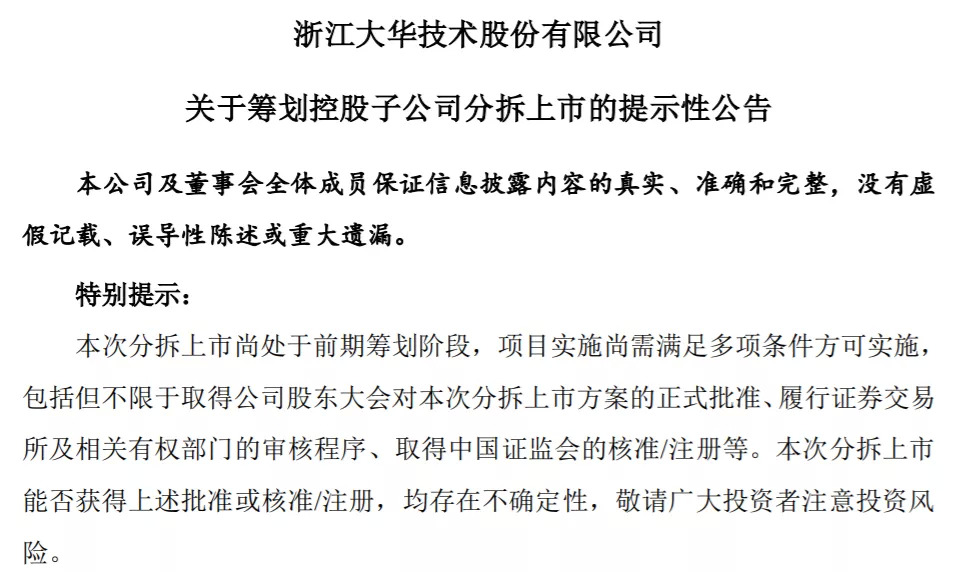 公告还提示称,本次分拆上市事项在实施过程中仍然会存在各种不确定因素,可能会影响华睿科技上市筹划和决策事宜,本次分拆上市事项存在一定不确定性。