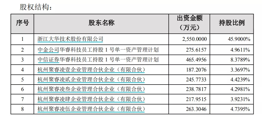 截至公告发布日,华睿科技共有20多位股东,其中上市公司大华股份持有其45.9%的股权,其余持股5%以上的股东还包括中金公司华睿科技员工持股1号单一资产管理计划、中信证券华睿科技员工持股1号单一资产管理计划。