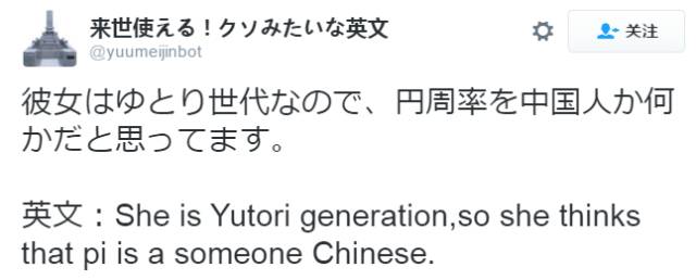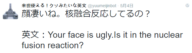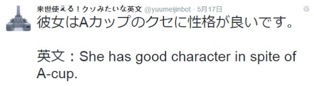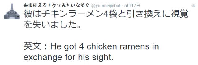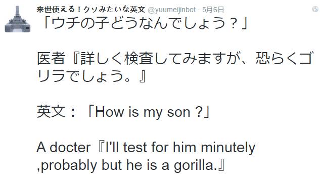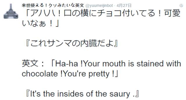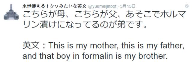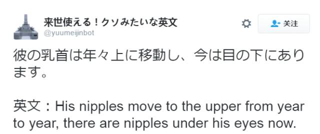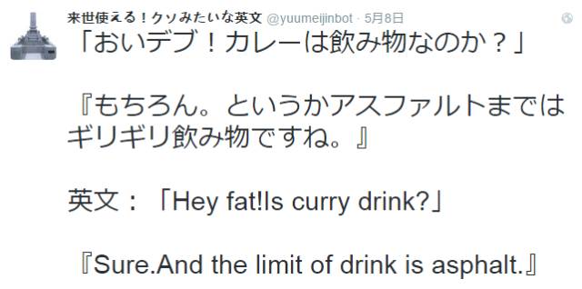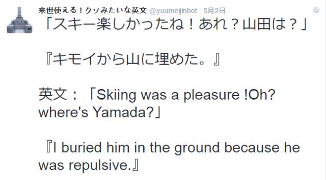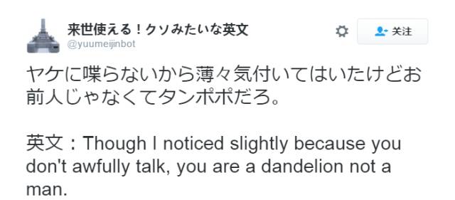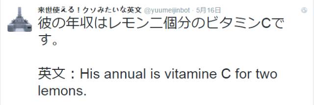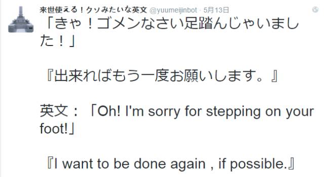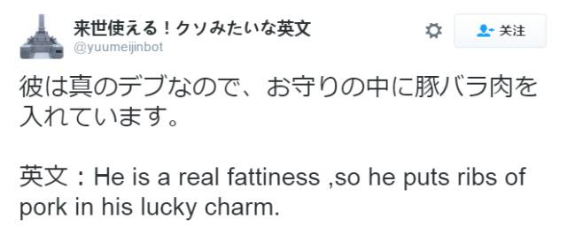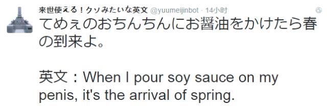 秉持着这样的优良传统,twitter 上的一个英文会话账号“来世再使用!大便一样的英文”(来世使える!クソみたいな英文)@yuumeijinbot也日日辛勤耕耘,传播基础英文会话知识的同时,传播着自己的恶趣味。
