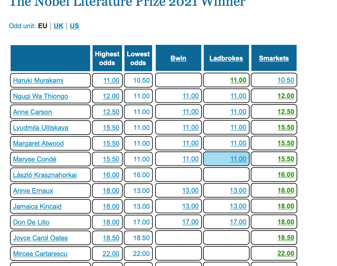 截至9月29日,诺贝尔文学奖的赔率榜上大多仍是我们熟悉的面孔——日本作家村上春树、肯尼亚作家恩古吉·瓦·提安哥连续多年排在前列,加拿大作家玛格丽特·阿特伍德以及美国作家唐·德里罗、乔伊斯·卡罗尔·欧茨、托马斯·品钦等人也榜上有名。榜单靠前相对冷门的作家包括俄国作家柳德米拉·乌例茨卡亚,匈牙利作家克拉斯诺霍尔卡伊·拉斯洛,西班牙作家哈维尔·马里亚斯和莫桑比克作家米亚·科托。事实上,说这几位作家“冷门”并不准确,至少他们都已获得了中文出版界的关注,作品的简体中文译本均有出版。与往年一样,中国作家残雪和阎连科也位居赔率榜高位。