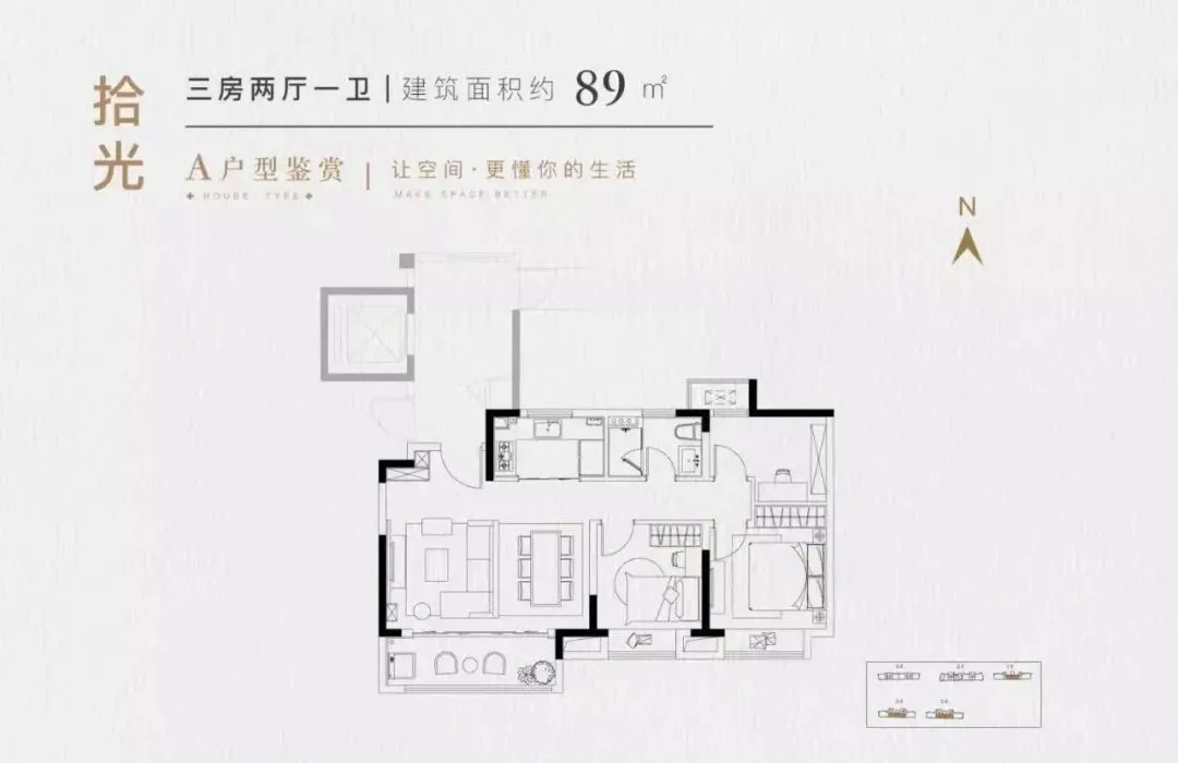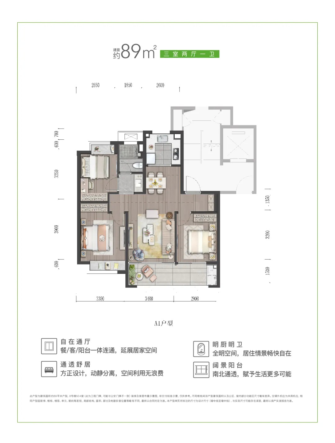 建面约89㎡三室两厅一卫:三开间朝南,南北通透,U型厨房,餐客一体化设计,双阳台设计。
