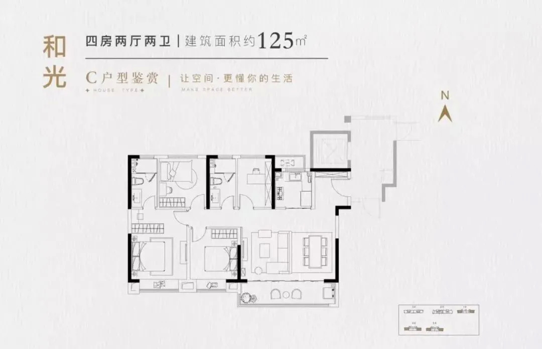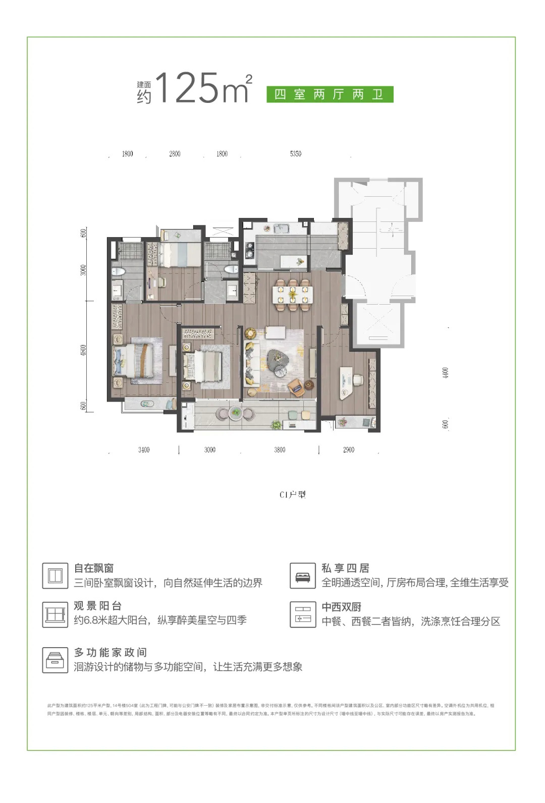 建面约125㎡四室两厅两卫:四开间朝南,透光性好,约6.8米超大阳台、南北通透,中西厨设计,洄游设计的储物空间。
