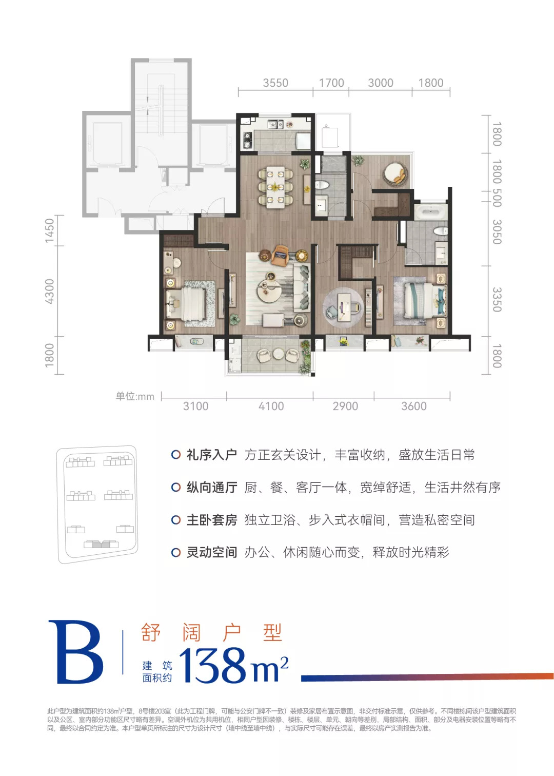 建面约138㎡户型:四开间朝南,光照充足,餐、厨、客、阳台一体化设计,空间灵活。