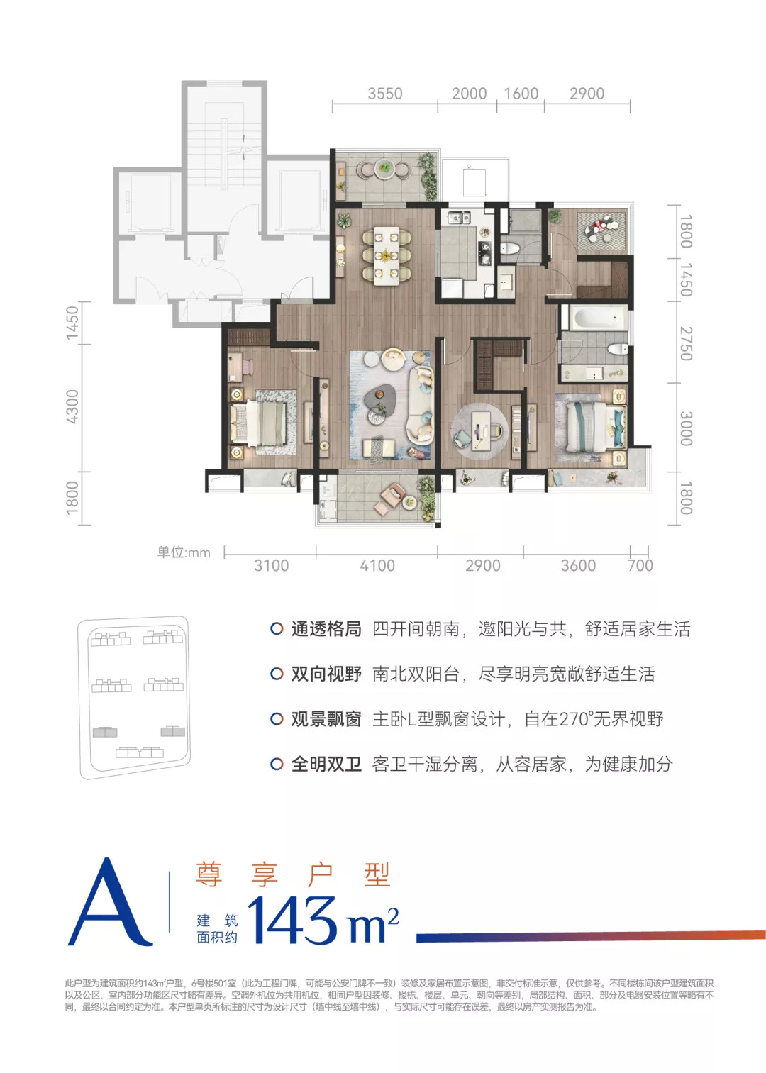 建面约143㎡户型:南北通透,空气流动性更强。南北双向阳台,南向主卧套房设计,超大飘窗,让生活充满想象。