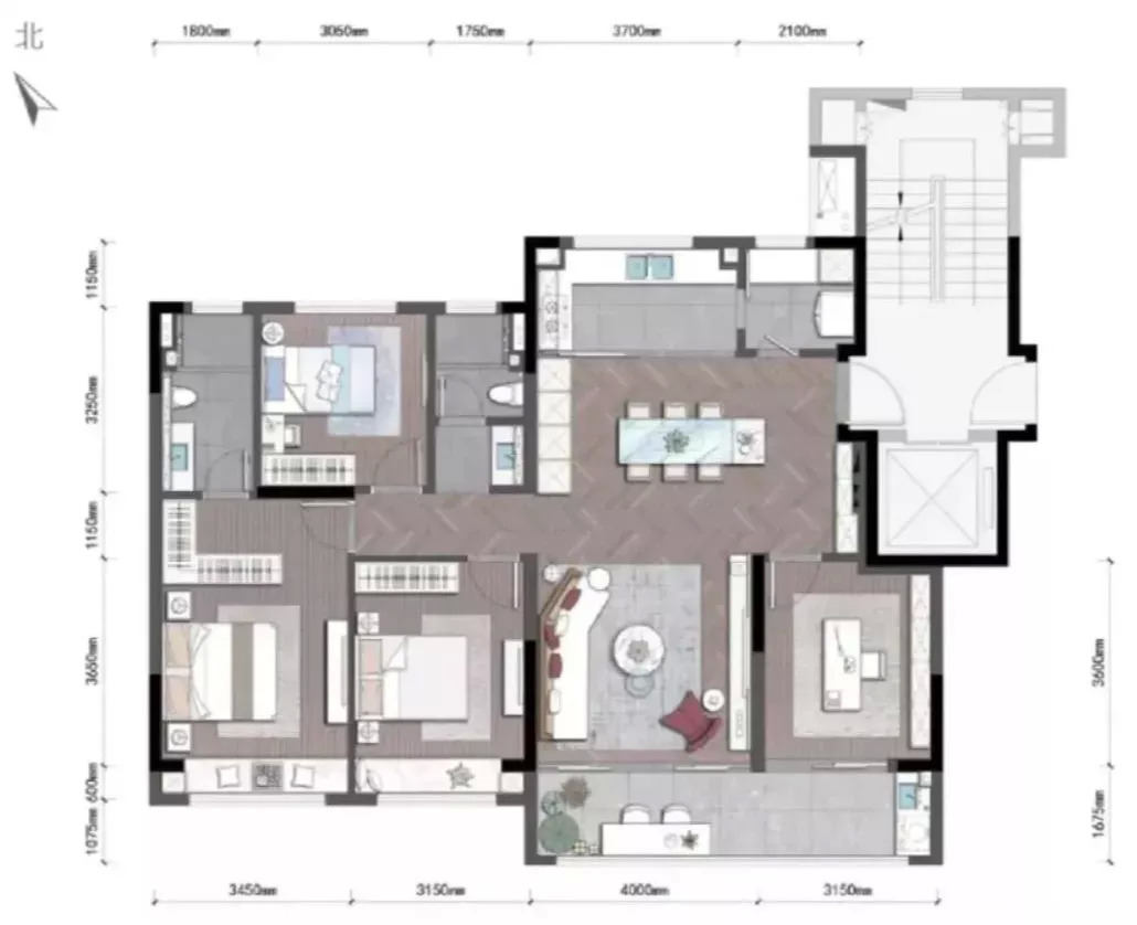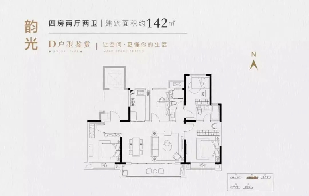 142㎡四房两厅两卫:大横厅设计,入户独立玄关,房间分布更合理,U型厨房,南北通透,主卧套房设计,客卫干湿分离。