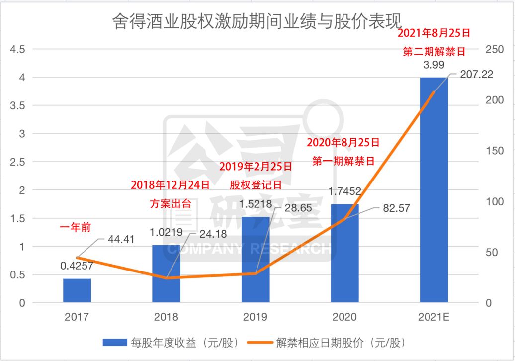 2018年12月24日,舍得酒业员工激励计划方案出台,激励计划股票来源为公司从二级市场回购的舍得酒业A股普通股,授予价格为10.51元,拟授予限制性股票数额合计不超过919.3万股,占总股本的2.73%。激励草案激励对象总人数为421人,为公司任职的董事、高级管理人员、中层管理人员及核心骨干。