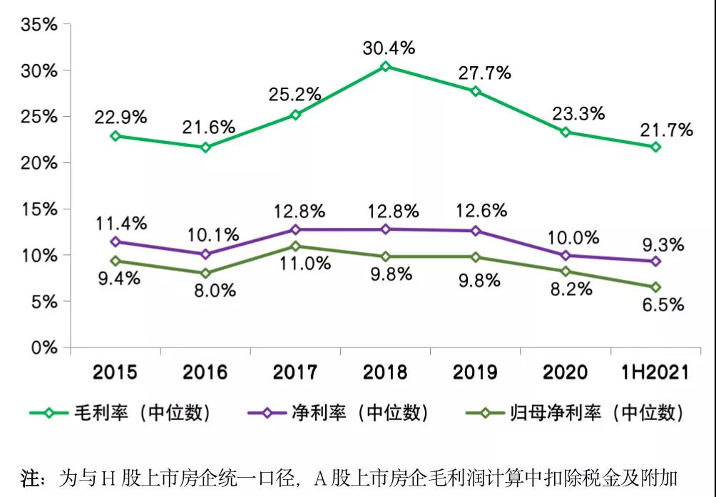 CRIC数据显示,今年上半年80家典型上市房企毛利率中位数仅为21.7%,同比降低1.6个百分点。净利率和归母净利率中位数分别降低0.6和1.7个百分点至9.3%和6.5%。三大核心指标均呈现下行趋势,上半年降幅较2020年进一步扩大。