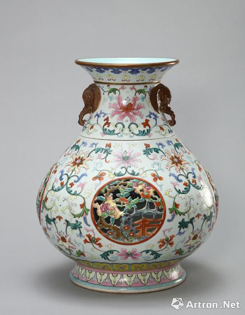 清乾隆 洋彩开光镂空‘四时富贵’图象耳转心瓶