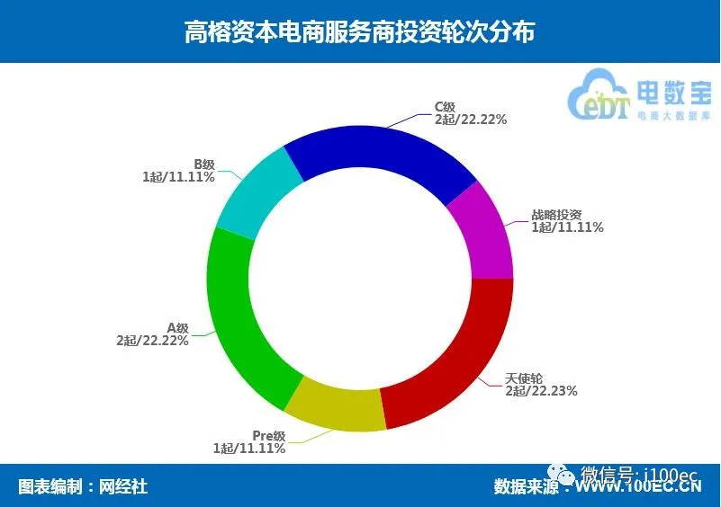 数据统计显示,在高榕资本的投资中,天使轮、A级、C级各有2起,各占22.22%,PreA级、战略投资、B级各有1起,占比达11.11%。