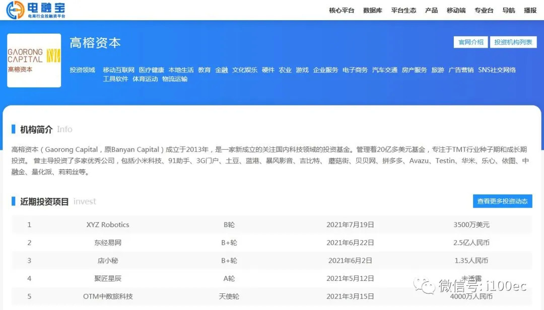据网经社“电融宝”(FA.100EC.CN)显示,高榕资本曾主导投资了多家优秀公司,包括小米科技、91助手、3G门户、土豆、蓝港、暴风影音、吉比特、 蘑菇街、贝贝网、拼多多、Avazu、Testin、华米、乐心、依图、中融金、量化派、莉莉丝等。