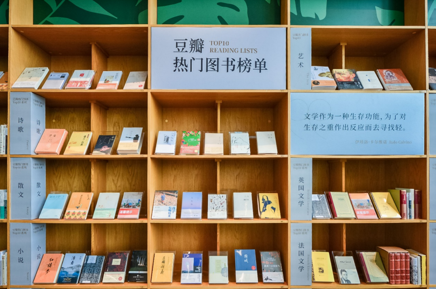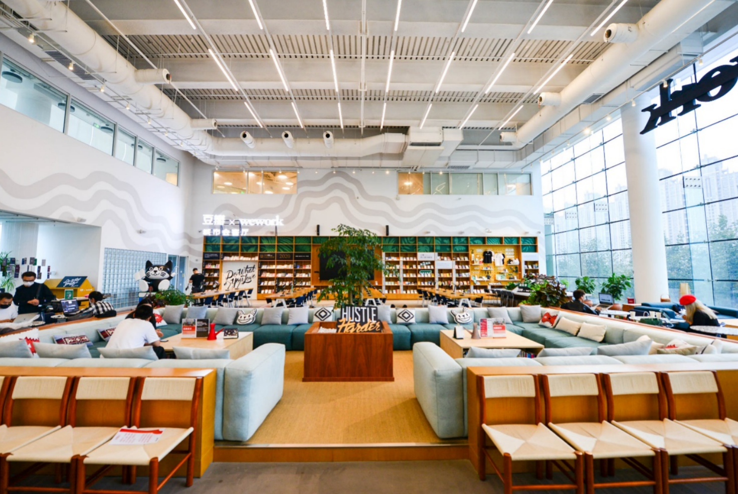 该空间基于WeWork本身的共享办公空间改造而来,除了常见的沙发、椅子、咖啡吧台,空间尽头的一面书阁陈列了豆瓣2020年度读书榜单与豆瓣热门图书Top10系列书单等,总计40多类,近500种图书,是对豆瓣线上图书榜单的线下复刻。