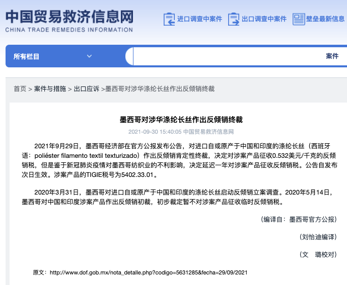 2020年3月31日,墨西哥对进口自或原产于中国和印度的涤纶长丝启动反倾销立案调查。2020年5月14日,墨西哥对中国和印度涉案产品作出反倾销初裁,初步裁定暂不对涉案产品征收临时反倾销税。