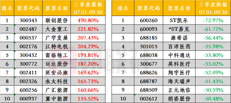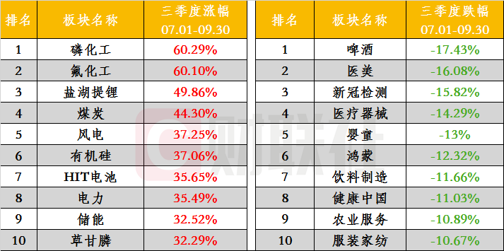 A股三季度今日收官,指数整体表现平稳。两市个股及板块涨跌幅排名出炉,联创股份以490%涨幅夺魁,大金重工、广宇发展、江特电机累积涨幅均超200%,前十个股中半数是锂电池概念。跌幅榜上,ST凯乐和*ST易见跌幅均超60%,前十的个股中有5只是科创板、创业板的近端次新。涨幅前十的板块基本为能源、资源行业,磷化工和氟化工累计涨超60%。跌幅居前的板块以泛消费为主,啤酒板块三季度下跌17.43%,上半年大涨的医美跌幅排名第二。