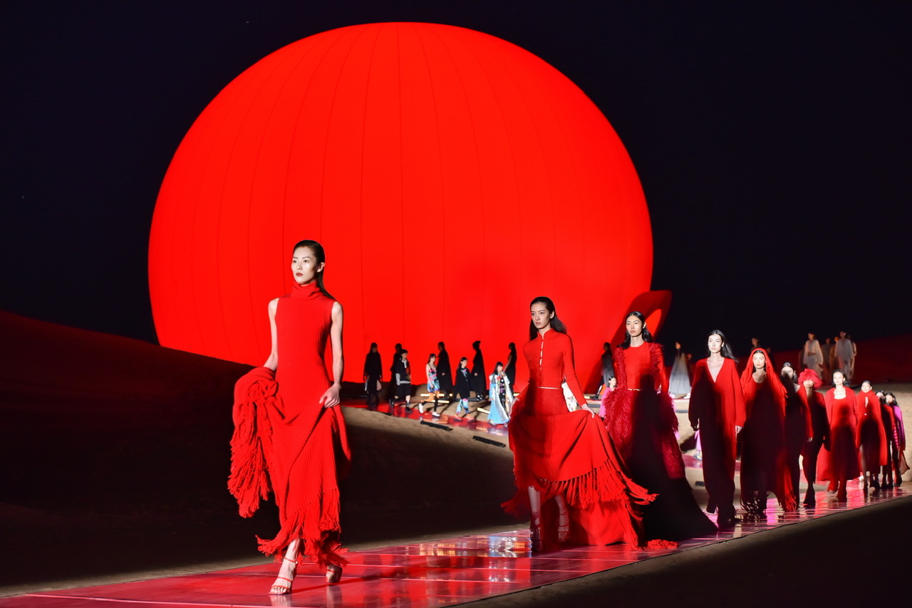日落时分,这场羊绒时装大秀准时开启。模特们从一座巨大的红色球体装置中鱼贯而出,沿着一条蜿蜒回转的沙漠走廊,踩着力量感十足的电子音乐节拍向上百名观众走来。而几台无人机在大漠星空中盘旋,配合提前架好的摄像机,为守候在直播间的观众送去实时的现场直播。