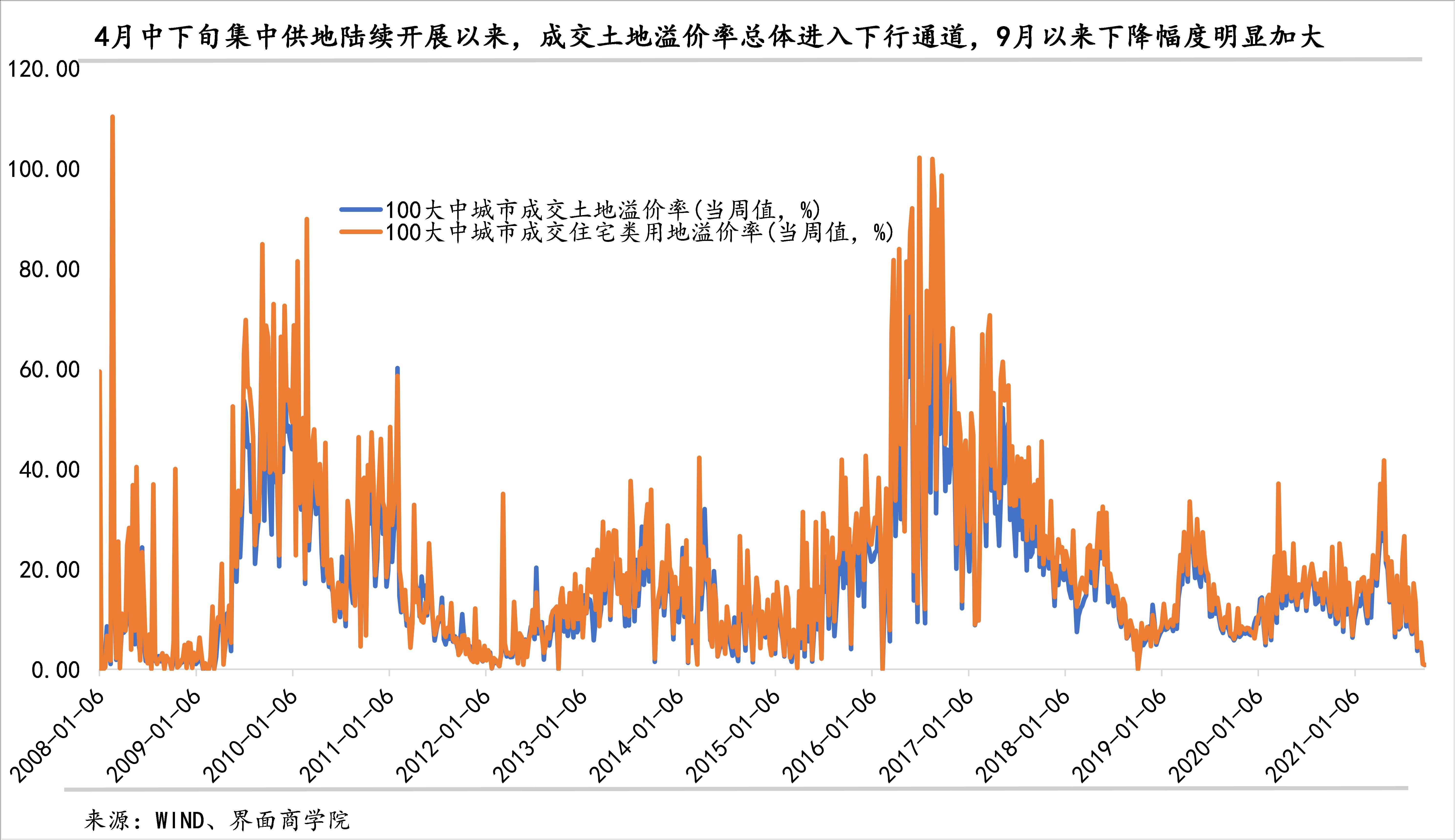 4、在土地供应面积减少的背景下,成交率和溢价率双双下降,显示房地产企业拿地积极性不高,这种情况在9月份进一步加剧。截至9月份前四周,土地供应面积同比增速持续负增长,100个大中城市供应土地面积同比下降16%,土地规划建筑面积同比减少16%,降幅均较前8个月加大。在供给减少的背景下,自4月中下旬集中供地陆续开展以来,成交土地溢价率和成交住宅类用地溢价率却均进入下降通道,9月份降幅扩大,到9月第四周已经接近于0。前8个月成交率84%,较上年下降了3个百分点(成交率是用累计成交土地数量与累计供应土地数量的比值估算,为降低供应和成交的时间差影响,未考虑9月数据)。