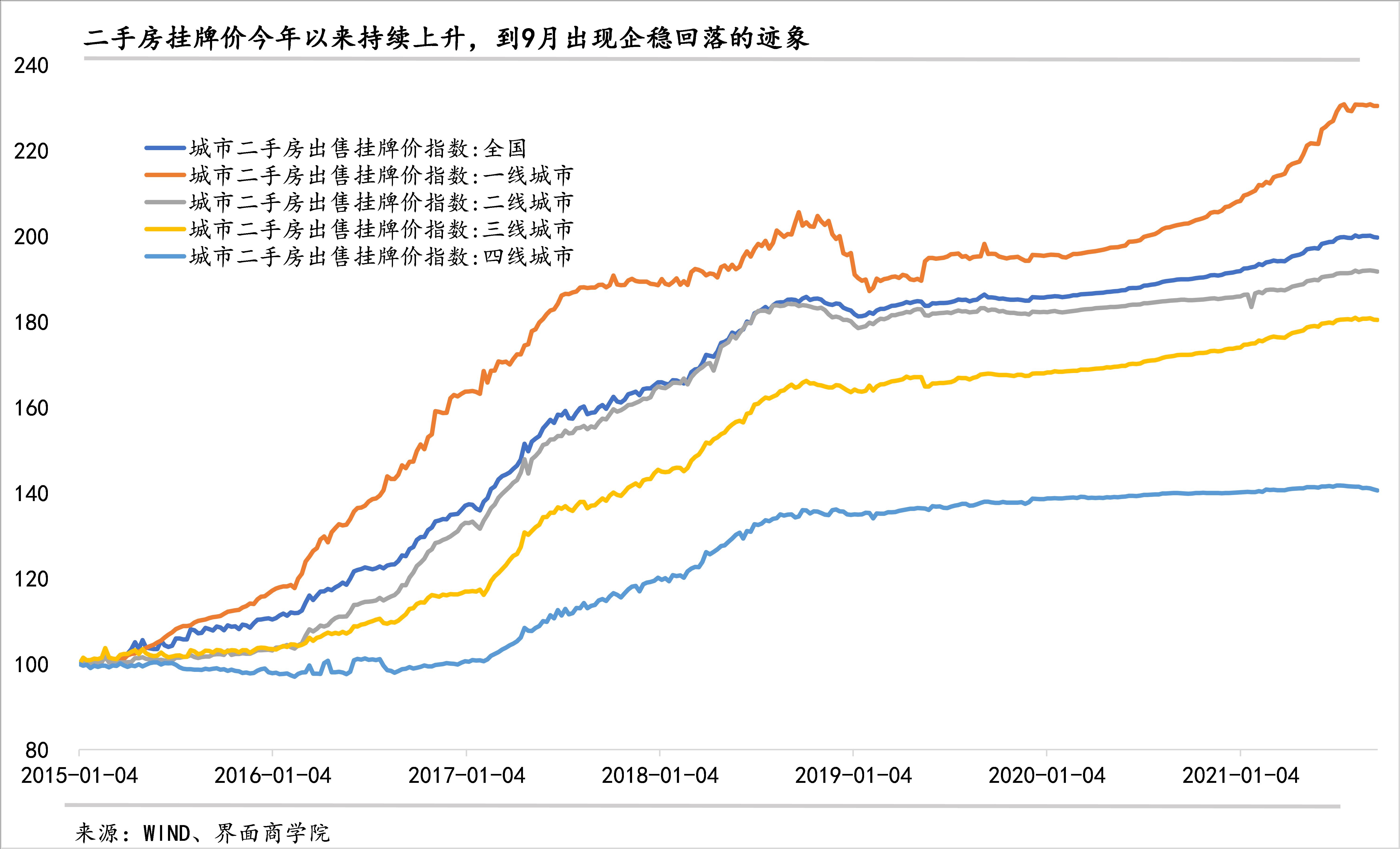 去年以来单边上涨的全国城市二手房挂牌价格指数自年初以来进一步加速上升,但7月份以来,该指数明显企稳,甚至在9月有向下的迹象。其中,一线城市表现尤为明显,上涨的速度更快,企稳的态势更清晰,与2020年同期相比,目前一线城市挂牌价格指数上升了13.5%。