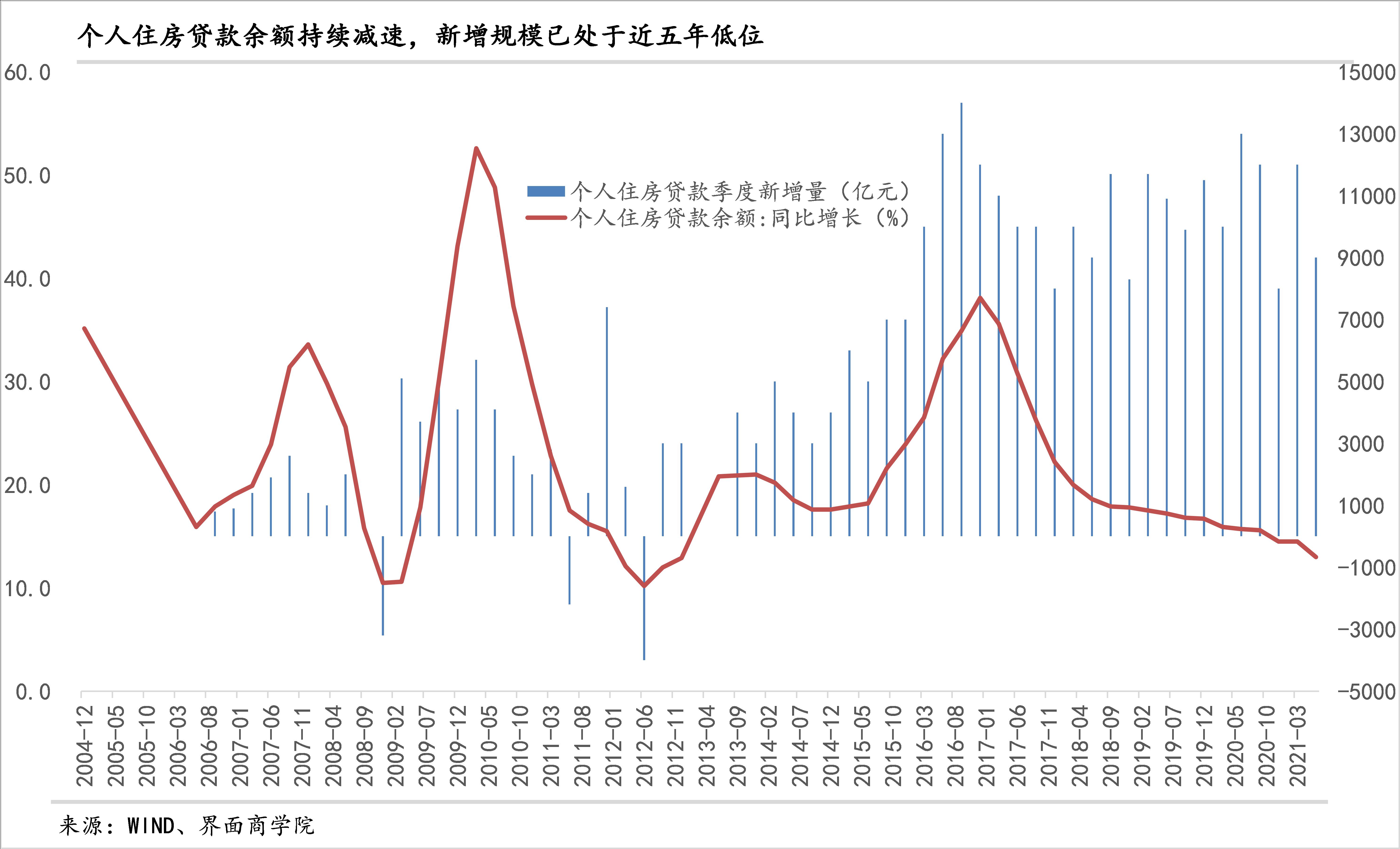 住房开发贷款余额同比增速自2019年4季度以来都慢于个人住房贷款,并且其下降的速度显著快于个人住房贷款。2020年末,住房开发贷款余额增速突破有统计以来历史最低值,此后进一步下降,6月末,住房开发贷款余额增速已经降至3.4%。