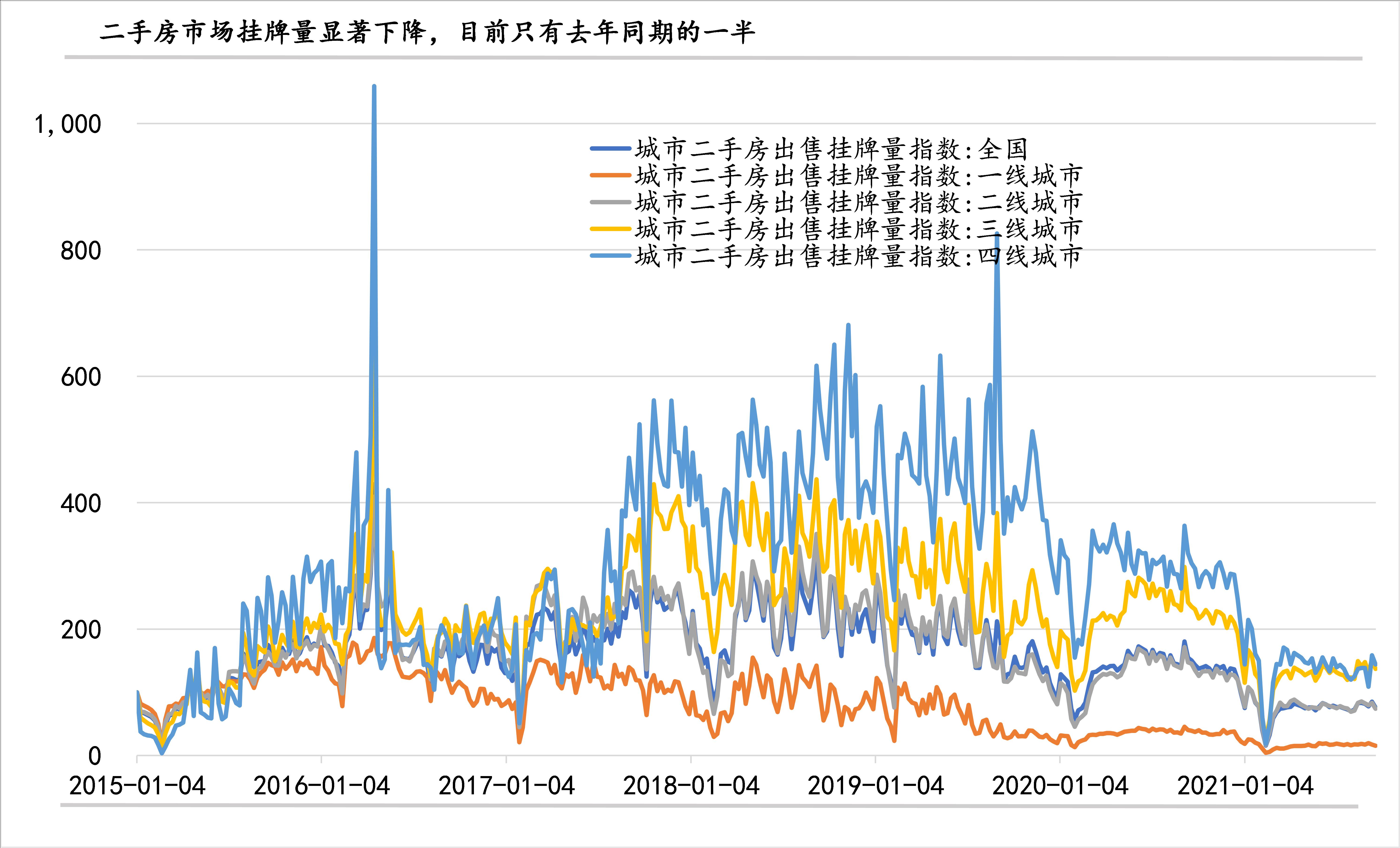 2、二手房市场挂牌量总体收缩明显,挂牌价格持续上升态势已企稳,甚至在9月有回落迹象。截至9月26日,全国城市二手房出售挂牌量指数较2020年9月同期下降了55%,也比疫情前9月上旬高点收缩了36%。按一二三四线城市看,以2020年9月同期相比,一线城市下降的幅度最大,四线、二线、三线城市次之,一线到四线城市下降幅度依次为67%、53%、49%、57%;与2019年9月同期相比,四线城市下降幅度最大,一二线城市相当,一线到四线城市下降幅度依次为35%、34%、30%、49%。