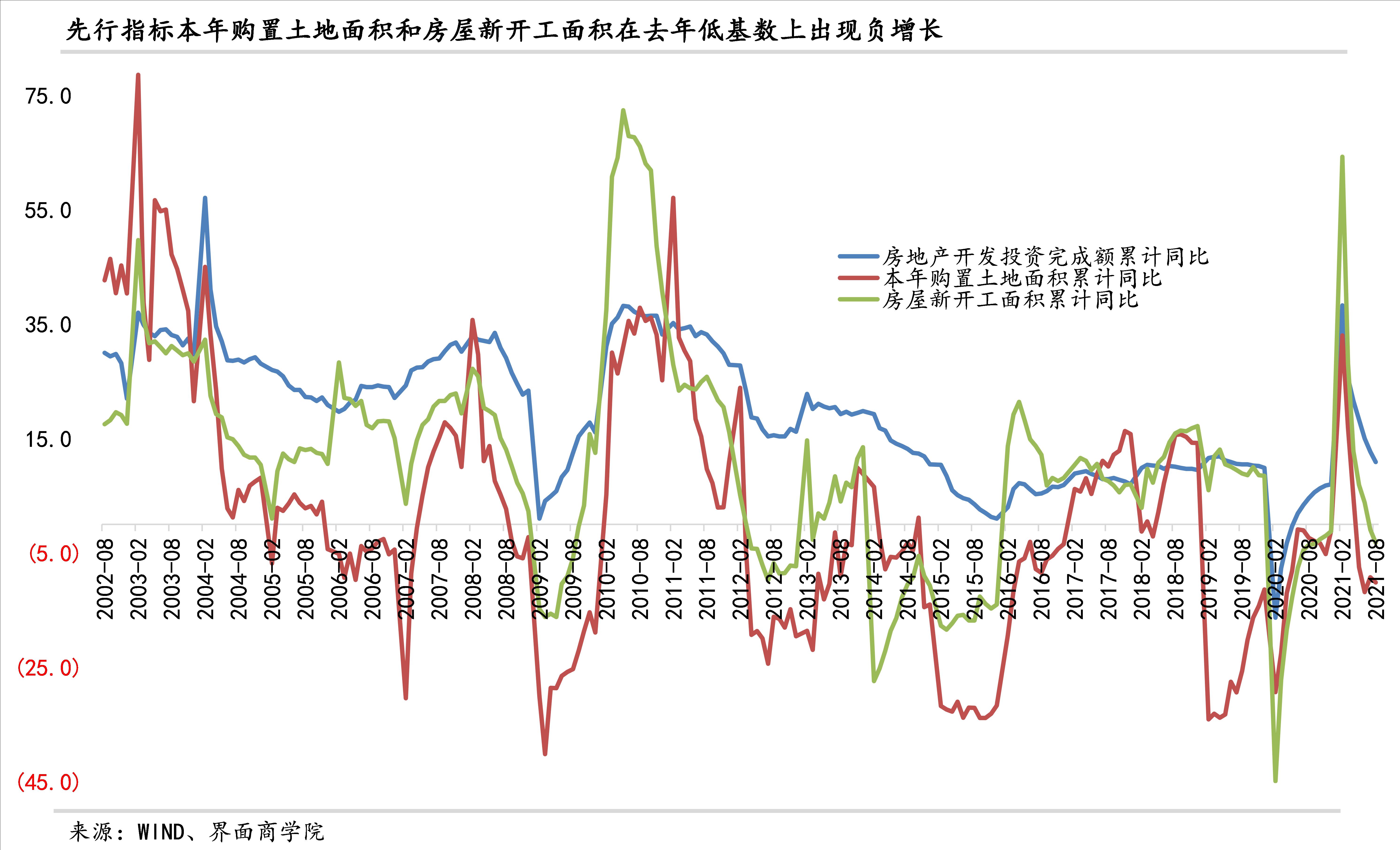 5、另外两个房地产行业的先行指标——土地购置面积与房屋新开工面积,在去年低基数的基础上先后出现负增长。本年土地购置面积累计同比增速5月转负,到8月同比降幅为10.2%,房屋新开工面积累计同比增速在7月转负,8月降幅进一步扩大为3.2%。从历史数据看,他们与房地产投资的相关系数均超过0.7,通过下图可以直观地看到,这两项指标负增长往往对应着房地产投资增速较大幅度的下降。