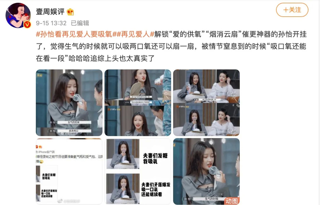 芒果TV于周三更新的《再见爱人》同样是热搜话题制造机,“催更团”更是在孙怡等节目嘉宾玩梗之下被诸多网民熟知,解锁“爱的供氧”、“烟消云扇”等「催更神器」的话题持续吸引新的“路人观众”关注到节目更新日子,这也是综艺营销方可参考的范例。