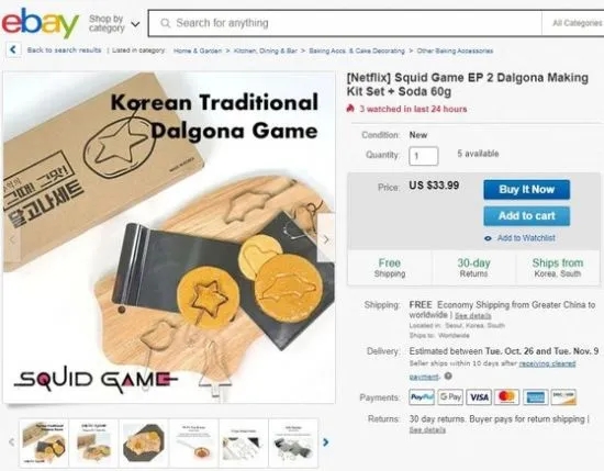 剧集火爆的同时,其周边产物同样火爆全球,在eBay等国际电商网站,剧集里的运动服、定制糖饼等相关周边一路热销,《鱿鱼游戏》被多方认为是继《寄生虫》之后再次在全球范围内证明韩流能力的重要作品。